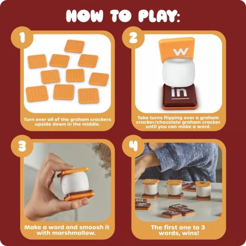 ¡Apila, deletrea y gana! forma palabras con galletas graham y chocolate, toma un malvavisco y aplástalo. ¡El primero en formar 3 s'mores gana!