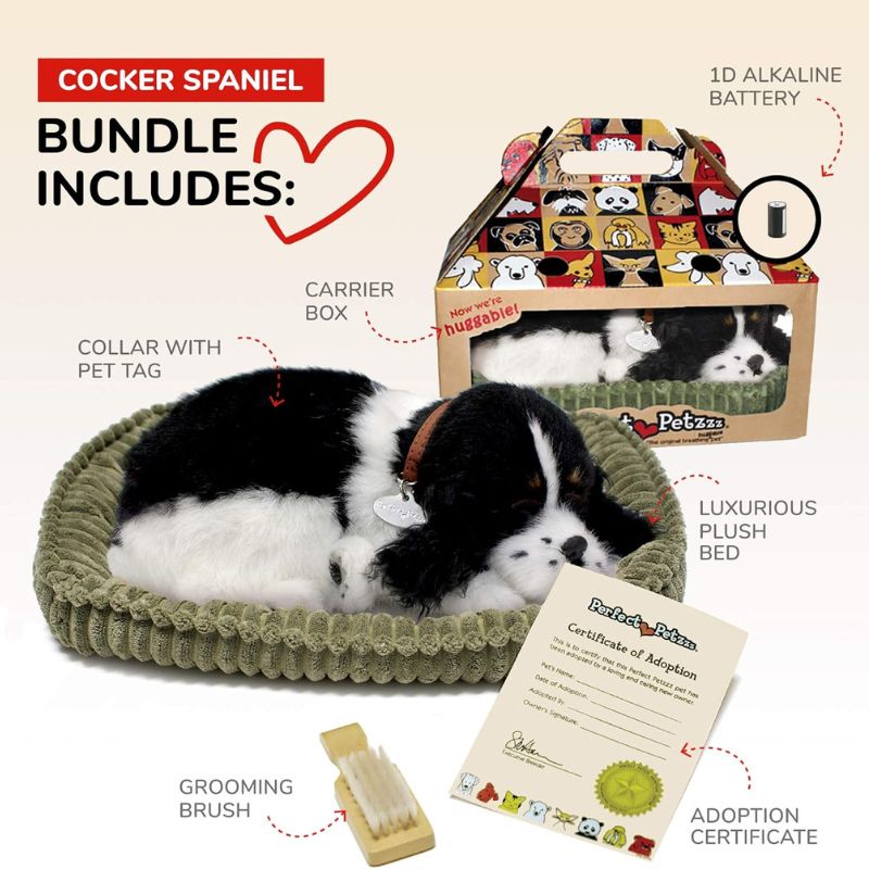 En cada set Perfect Petzzz Cocker Spaniel encontrarás un collar con una etiqueta para mascotas, una lujosa cama de lujo, una caja de viaje, un cepillo de aseo y una batería alcalina 1 D. Además, un certificado de adopción para completar su experiencia de propiedad de Petzzz.