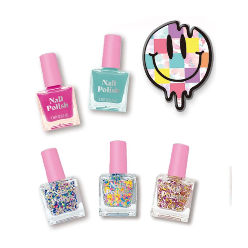 Contenido: 2 esmaltes de uñas perfumados, 3 esmaltes de uñas perfumados con purpurina y 1 lima de uñas.