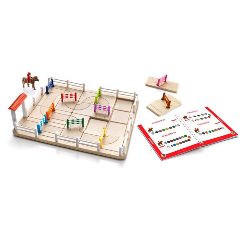 Contenido: Tablero de juego, caballo con jinete, puertas de salto, folleto con 80 desafíos.