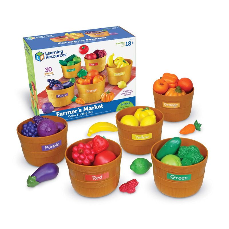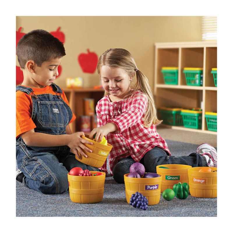 El conjunto de clasificación de color desarrolla habilidades de reconocimiento de color y clasificación utilizando bushels de productos realistas y de tamaño relacional.
