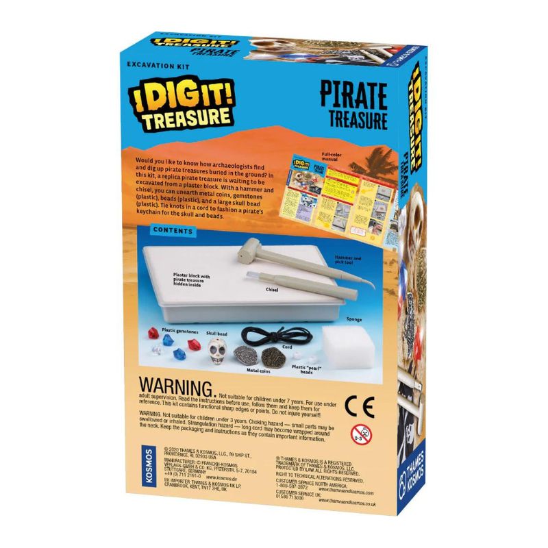 Con un martillo y un cincel, puedes desenterrar monedas de metal, piedras preciosas (plástico), cuentas (plástico) y una gran cuenta de calavera, mientras aprendes cómo los verdaderos arqueólogos encuentran y desentierran tesoros piratas enterrados en el suelo.