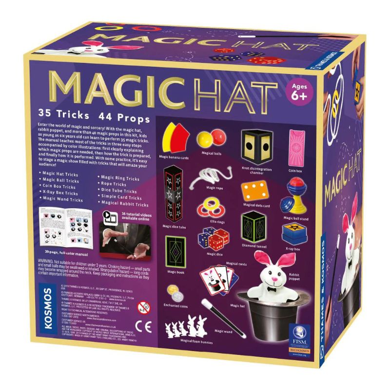 El sombrero mágico y el títere de conejo, cuentan con más de 40 accesorios mágicos más, niños de hasta seis años pueden aprender y realizar 35 trucos de magia.