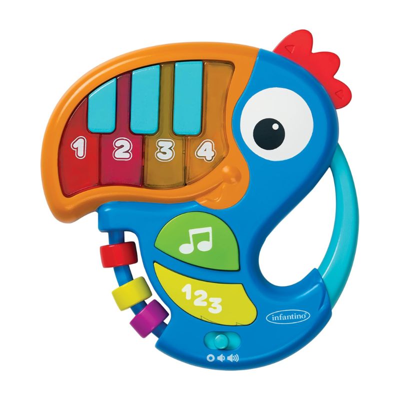 Este divertido tucán tiene teclas de piano iluminadas que introducen a los pequeños aprendices a la música y los números.