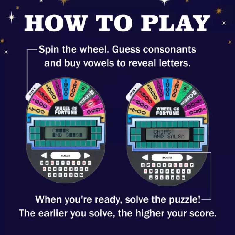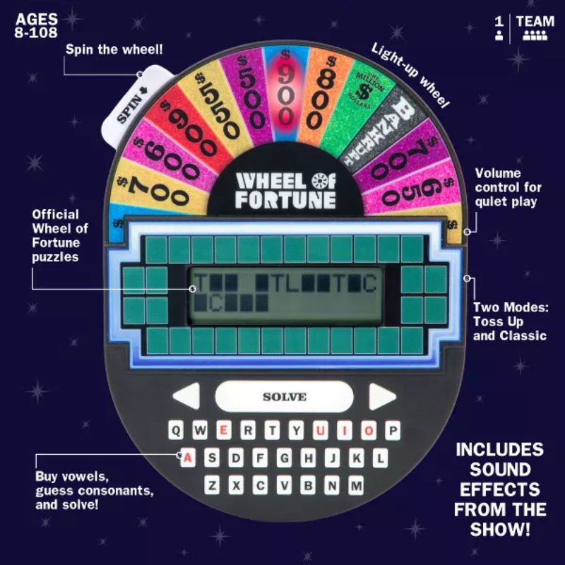 Este juego electrónico portátil para niños y adultos es como un concurso de televisión: gira la ruleta, adivina las letras y resuelve 300 rompecabezas. Un divertido juego de viaje para todas las edades.
